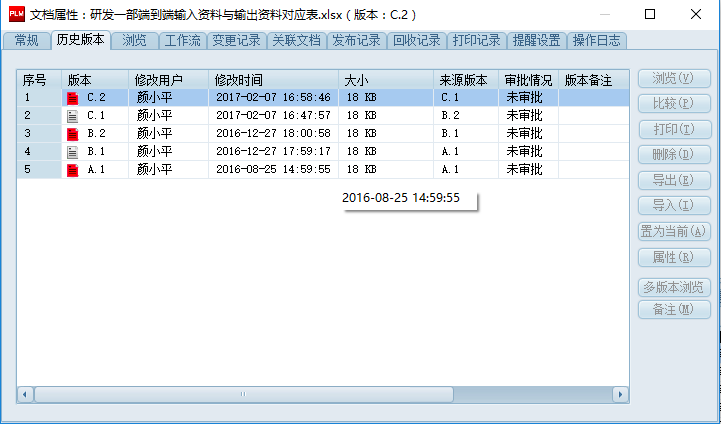 3、各类文档均可能单独查询历史版本、变更记录、打印记录、回收记录、执行的流程以及详细的操作日志,便于追溯文件的各类活动轨迹。
