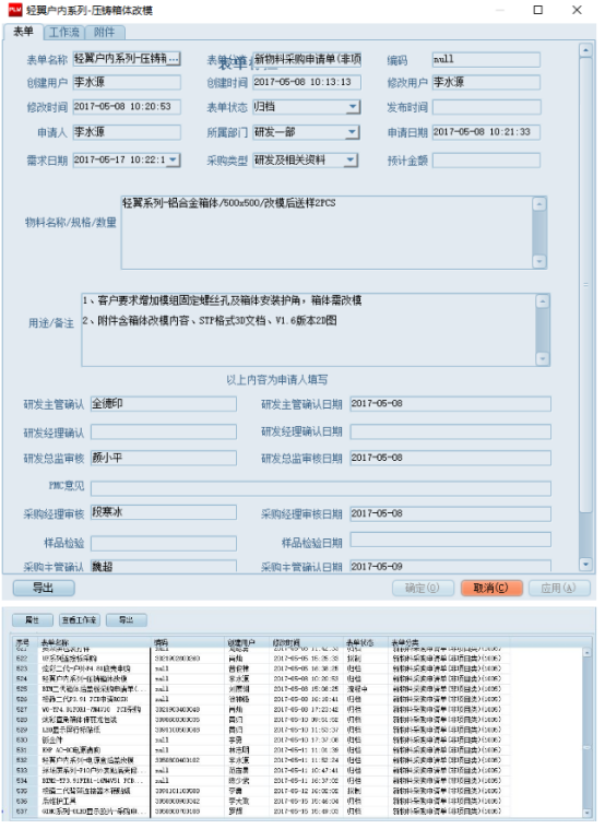 7、窗体式的表单,各部门固化的业务流程,统一平台记录管理,并与EPS系统数据集成,能够获取EPS系统数据,协助用户快速完成报表;此类窗体式的表单可直接导出pdf档文件,便于纸质外发传阅。