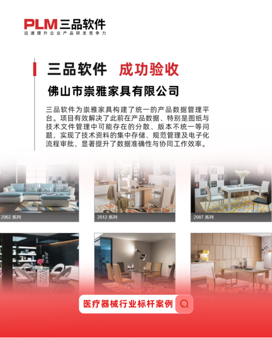 同时,通过系统固化标准化审批与变更流程,显著加速研发进程,减少因沟通不畅或数据错误造成的生产失误,从而保障了产品数据的准确性。对于崇雅家具这样业务覆盖多个海外市场的企业而言,三品PDM系统的有效实施,成功助力企业提升产品质量、缩短上市周期并增强市场竞争力。