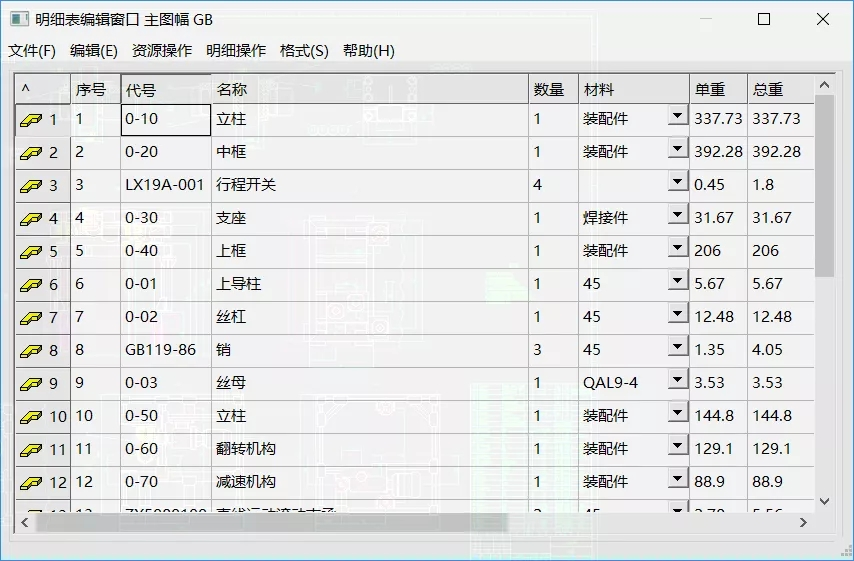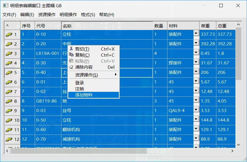 选中所有行,在列表区鼠标右键—“添加物料”:
