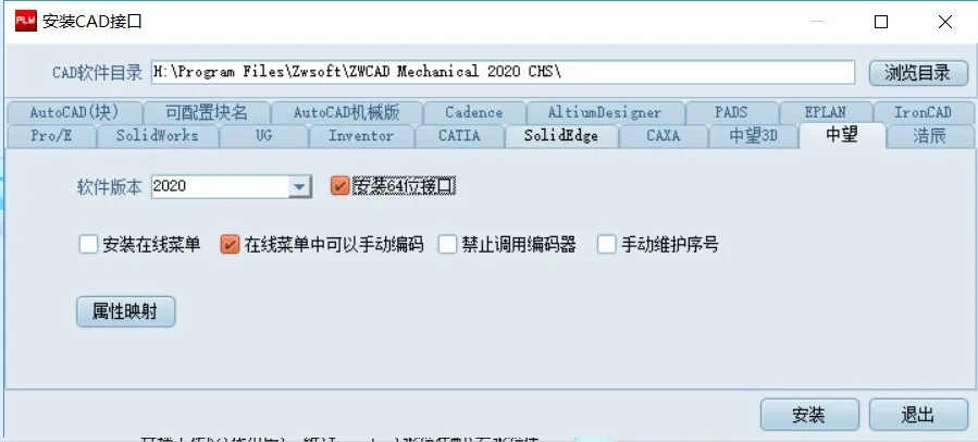 选择“中望”的安装目录、软件版本等,点 “安装”完成接口的安装。