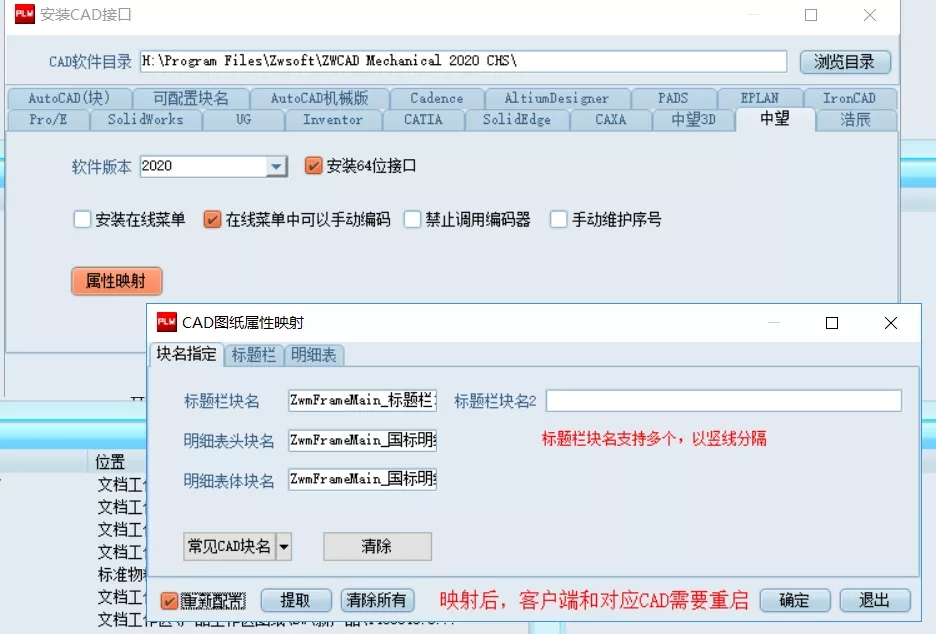点击“属性映射”进行图纸属性和PDM物料属性之间的映射关系设置: