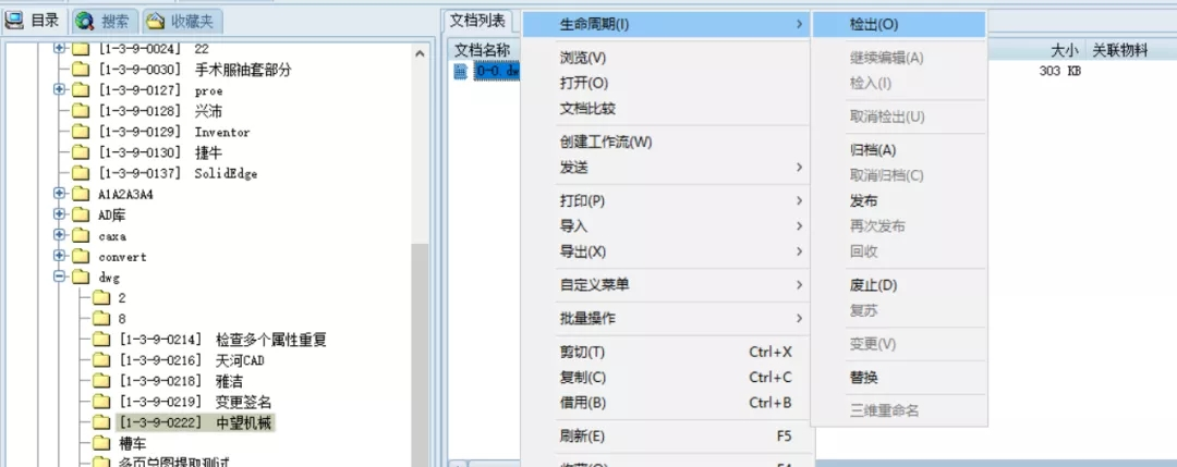 从本地导入一个中望机械文件到文档工作区,并选中它,右键—生命周期--检出
