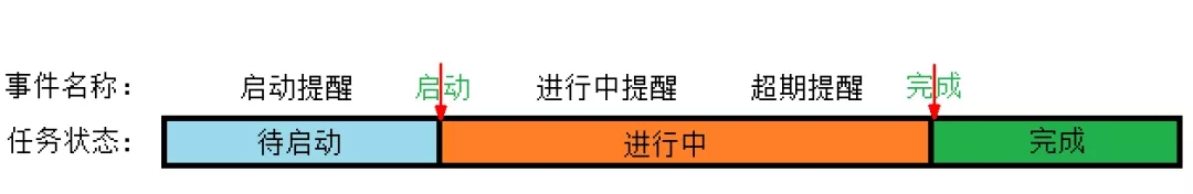 一个任务最少可以设置5个不同“事件”类型的邮件通知。为了便于大家理解通过下图直观说明邮件通知事件发生的阶段和时机: