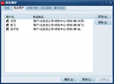 【常规】标签下设置岗位的基本信息。包括:岗位名称、岗位描述。【包含用户】该标签下,设置哪些用户被添加进入岗位。点击【添加】按钮,管理员可以将【用户】模块下的人员添加进岗位。所有这些被添加到岗位中的用户都具有该岗位所具有的特性,并通过登录系统后获得该类岗位可以执行的任务和权限。