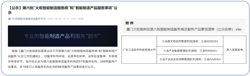 近日,第六批“火炬智能制造服务商”和“智能制造产品服务事项”正式在厦门火炬高新区智能智造服务平台网站公示结果,三品软件的“三品图文档协同管理系统[简称:三品EDM]V8.0、三品产品数据管理软件[简称:三品PLM]V8.0、三品产品全生命周期管理软件[简称:三品PLM]V8.0”三大产品成功入选,有幸成为厦门火炬高新区智能智造服务商资源池产品。