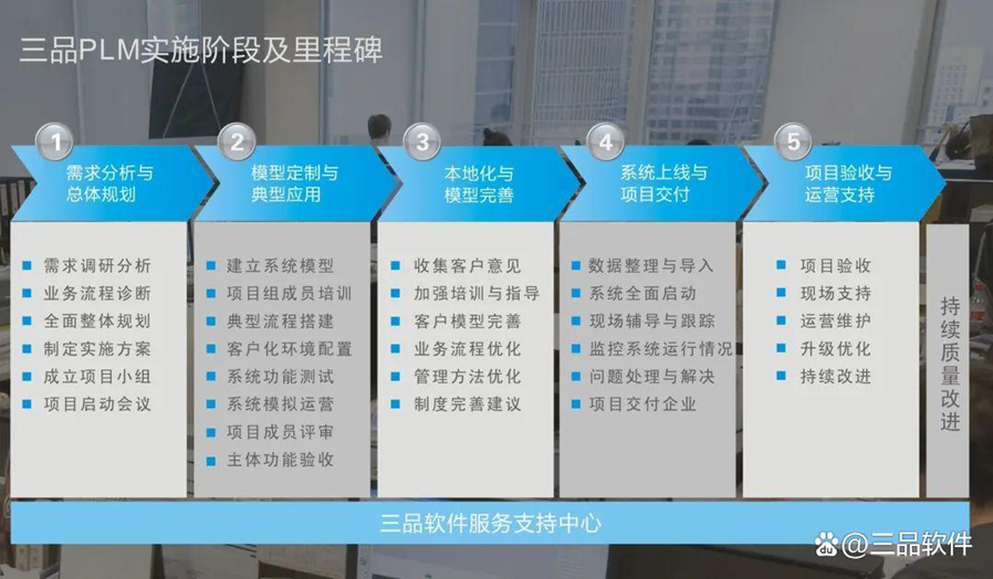 三品软件在多年PDM/PLM实施服务的经验基础上,不断地构思、改善, 积累了—套更加完整、更加快速、更加有效的实施方法。十多个不同的行业、数千家项目实施成功的事实证明了该方法的有效性。