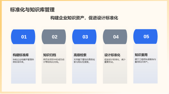 4.标准化与知识库管理:协助企业构建并管理标准件库、通用件库、典型结构库及设计规范库。通过分类与关联技术,将历史项目中的成功设计、故障案例、技术方案等进行结构化归档,形成企业知识资产。系统支持基于属性的高级检索与相似性搜索,便于工程师快速查询与重用,促进设计标准化,减少重复劳动。