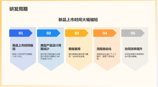1.研发周期显著缩短:通过数据快速检索与重用、流程自动化及协同效率提升,新品上市时间平均缩短15%-25%。某中型工程机械企业报告称,其典型产品的详细设计周期从原来的平均180天减少至145天。