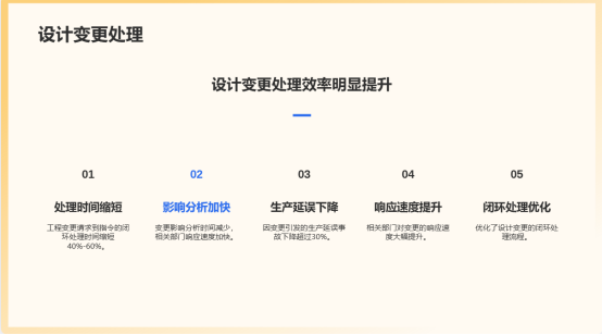 2.设计变更处理效率提升:工程变更请求(ECR)到工程变更指令(ECO)的闭环处理时间平均缩短40%-60%。变更影响分析时间减少,相关部门的响应速度加快,因变更引发的生产延误事故下降超过30%。