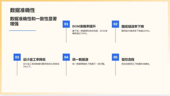 3.数据准确性与一致性增强:基于统一数据源和受控流程,BOM准确率接近100%,图纸版本错误率下降超过90%。设计返工率因数据问题导致的比率从平均12%降至3%以下。