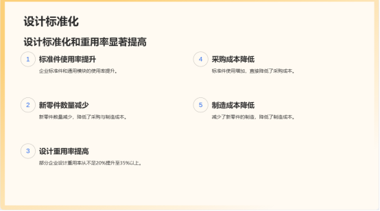 4.设计标准化与重用率提高:企业标准件和通用模块的使用率提升,新零件数量减少。部分企业实现设计重用率从不足20%提升至35%以上,直接降低了采购与制造成本。