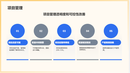5.项目管理透明度与可控性改善:项目进度可视,资源冲突可预警,使得项目延期率降低20%-35%。管理者能够更精准地进行资源规划和产能预测。