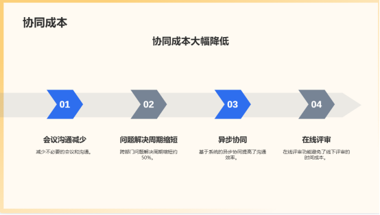 6.协同成本降低:减少不必要的会议和沟通,基于系统的异步协同和在线评审使得跨部门问题解决周期缩短约50%。