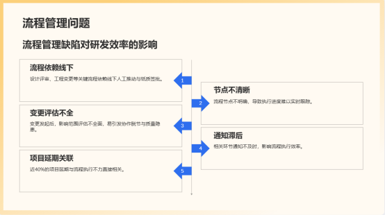 2.流程非标准化与执行不透明:设计评审、工程变更、项目审批等关键流程依赖线下人工推动与纸质签批,流程节点不清晰,执行进度难以实时跟踪。变更发起后,影响范围评估不全,相关环节通知滞后,易引发协作脱节与质量隐患。调研指出,近40%的项目延期与流程执行不力直接相关。