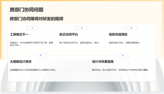3.跨部门协同壁垒高:机械设计、电气控制、工艺工装、采购生产等环节往往使用不同工具,数据格式不一,且缺乏有效的协同平台。信息传递异步、滞后,问题反馈周期长。特别是在复杂机电一体化设备开发中,跨领域设计冲突常在后期才暴露,造成大规模设计修改。