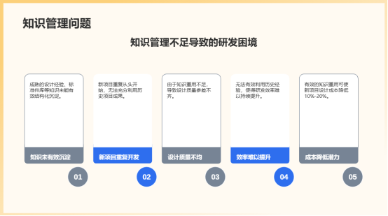 4.知识资产沉淀与重用不足:成熟的设计经验、标准件库、通用模块、故障解决方案等知识未能有效结构化沉淀。新项目重复从头开始,无法充分利用历史项目成果,导致设计质量不均且效率难以持续提升。行业分析表明,有效的知识重用可使新项目设计成本降低10%-20%。