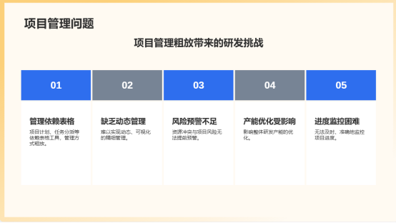 5.项目管理与资源调配粗放:项目计划、任务分派、进度监控、资源负荷管理多依赖表格工具,难以实现动态、可视化的精细管理。资源冲突与项目风险无法提前预警,影响整体研发产能的优化。