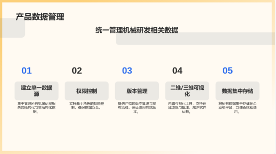 1.统一的产品数据管理(PDM)与电子仓库:建立企业级单一数据源,集中管理所有机械研发相关的结构化与非结构化数据。支持基于角色的权限控制,确保数据安全。提供严格的版本管理与发布流程,保证所有环节使用唯一有效版本。内置的二维/三维可视化工具支持在线轻量化浏览与批注,减少对原生设计软件的依赖。