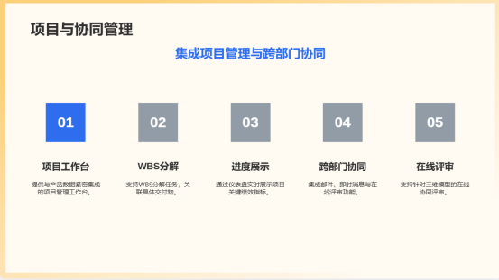 3.一体化项目与协同管理:提供与产品数据紧密集成的项目管理工作台。支持WBS分解任务,关联具体交付物(如图纸、文档),实现任务进度与数据状态的联动更新。通过仪表盘实时展示项目关键绩效指标,如里程碑达成率、任务完成率、资源利用率。集成邮件、即时消息与在线评审功能,构建跨部门、跨地域的协同工作环境,支持针对三维模型的在线协同评审。