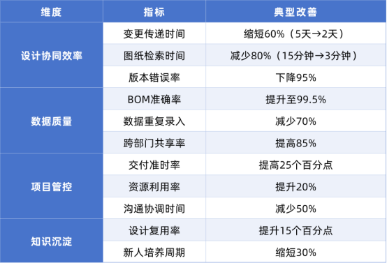 基于大量行业实践数据,PLM系统为非标制造企业带来显著改善: