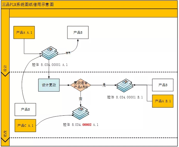 腔体(8.034.00001)图纸设计归档后,如果需要设计更改,系统将提示该图纸被产品A和B引用。然后人工判断,该图纸更改后是否适用于A和B,若是则直接对腔体图纸升版(B.1),A和B都将引用新版图纸;如果更改后的图纸仅产品B能适用,产品A不适用,则需要拷贝一份腔体图纸,申请新的编码和图号(8.034.00002),产品A引用新图号的图纸。