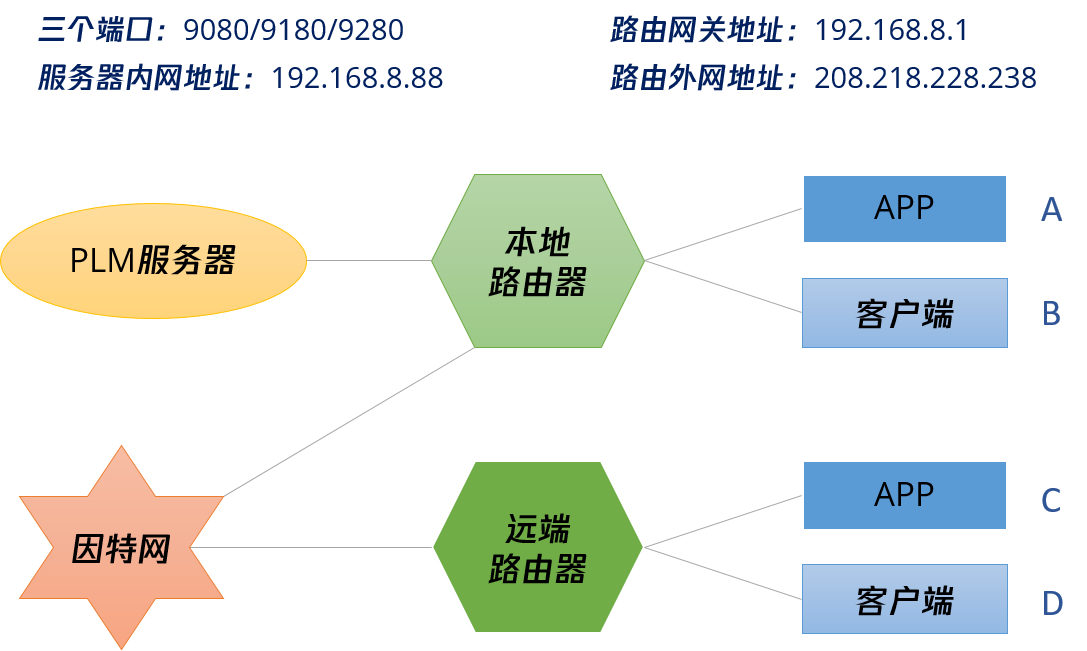 没有在本地路由器做任何映射之前,A和B可以通过192.168.8.88和对应的三个端口9080/9180/9280 访问PLM服务器。但是C和D就不能了。因为C和D没有直接连接在本地路由下,是不能直接通过192.168.8.88这个地址进行连接的。如果要C和D也能够访问PLM服务器,就必须要在本地路由器中进行端口设置了。