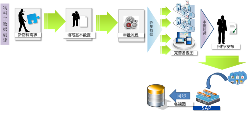 实现企业新物料的申请、审批承认后,通过三品PLM传输到SAP ERP物料表中,从而作为ERP中可信的、合规的物料信息;