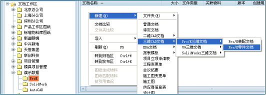 PLM系统操作指引:在三品PLM系统中,可便捷地基于模板创建新文档。进入【文档管理】的“工作区”,在目标位置右键选择【新建】。根据需求选择文档类型,例如依次选择【新建】→【三维CAD文档】→【Pro/E三维文档】→【Pro/E零件文档】。