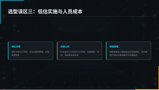 PLM的本质是管理变革,而非单纯的IT项目。其成功与否,三分靠软件,七分靠实施。企业常犯的错误是只关注软件许可费用,而低估了咨询、培训、数据迁移以及业务流程再造所需投入的时间和内部资源。选择拥有丰富行业实施经验、特别是深谙珠三角制造业特点的服务团队至关重要。同时,必须将内部关键用户的培训与接纳度作为项目成功的关键指标进行规划。
